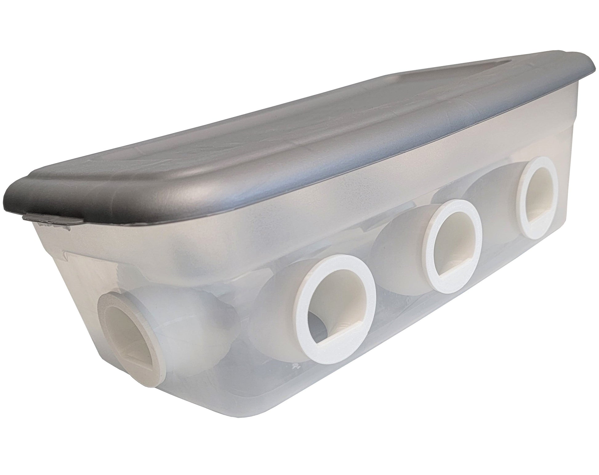 Rite Farm Products 8 port Quail and baby chick port style feeder, with a 6-quart capacity. Port style feeders are anti waist and will save you from losing expensive feed.  Ports are 1 1/2 inches inside and are 1 3/4 inches outside. Attaching ports with glue is optional and we do not glue them as they are a snug fit, and you can remove them to clean. Easy to keep clean plastic surface.  Outside measurements are 14 inches long by 8 inches wide by 5 inches tall overall. Will work with all youth and adult Quail, and baby chicks (chickens) up to approximately 4 weeks of age (depending on breed). Some fast-growing meat breeds will outgrow this after 2 to 3 weeks, such as Cornish Cross. Lid color may vary.