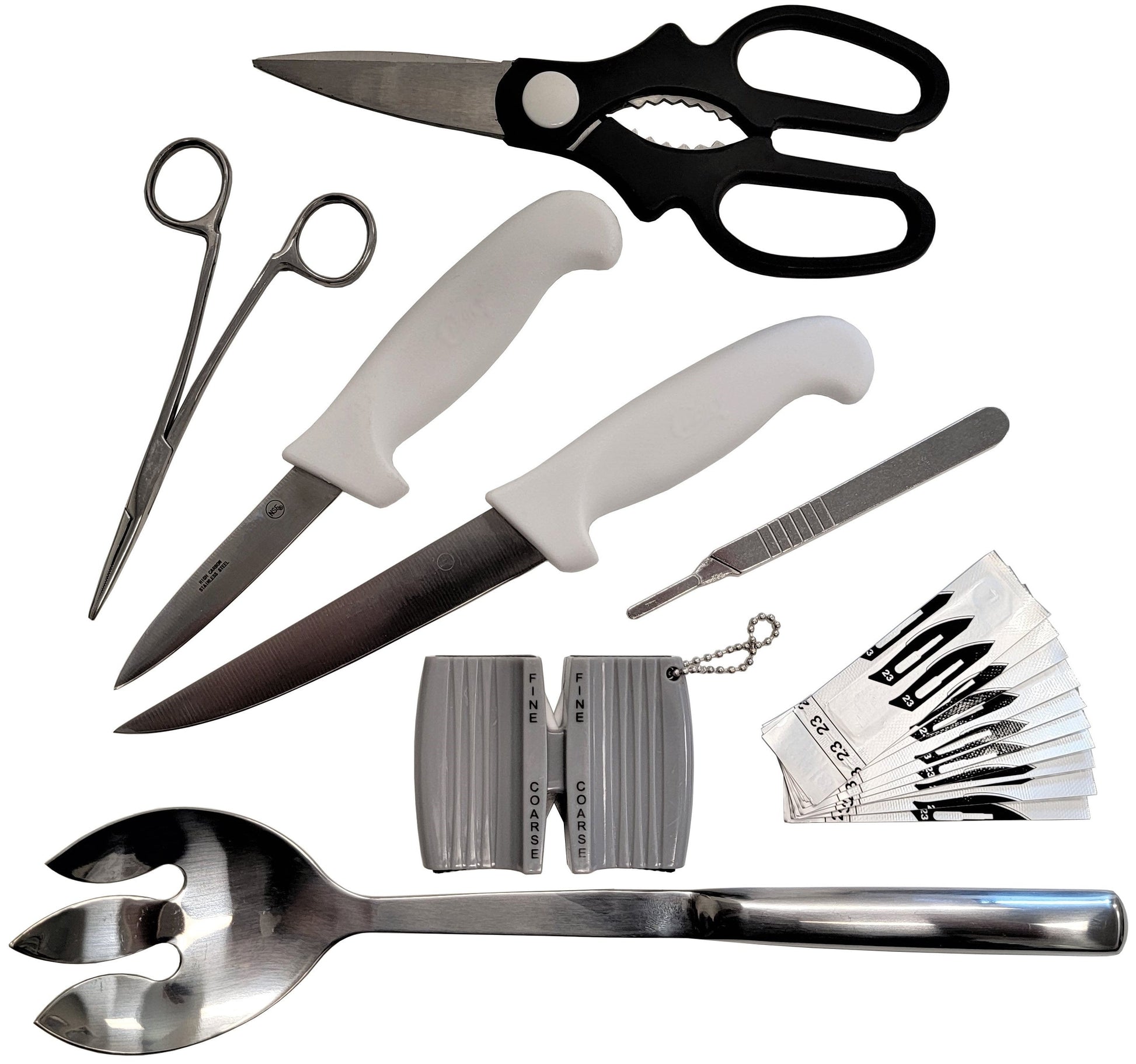 Rite Farm Products Master poultry processing and butcher knife kit. Everything you will need to process a bird after the scalding and plucking stage. Kit includes a 3 1/4 inch semi flexible butcher knife, a 5-inch stiff boning butcher knife, a poultry scissors, an organ & lung cavity scraping spoon, a scalpel with 10 blades, a hemostat forceps, & a knife sharpener. All items are made from quality food grade stainless steel and or carbon steel and are made to last. If you have a large processing party be sure to add some additional sets of knives (separate listing) to this kit so everyone in your party has a set of knives, the other tools just one is typically needed per party. Unless you have a big party and are processing over 100 birds at a time.