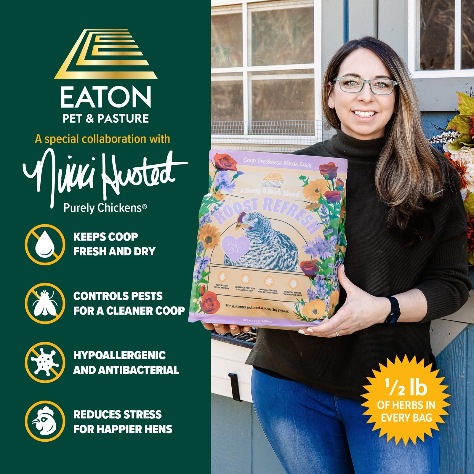 • Purely Chickens x Eaton Pet & Pasture: Roost Refresh is the result of an exciting partnership with Nikki Husted from Purely Chickens. With nearly two decades of experience in chicken keeping, Nikki's passion for poultry shines through in every aspect of Roost Refresh. Together, we've created a product that meets the highest standards of effectiveness and convenience, making coop care a breeze.